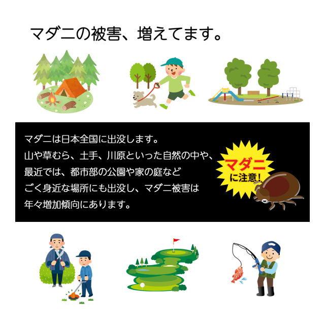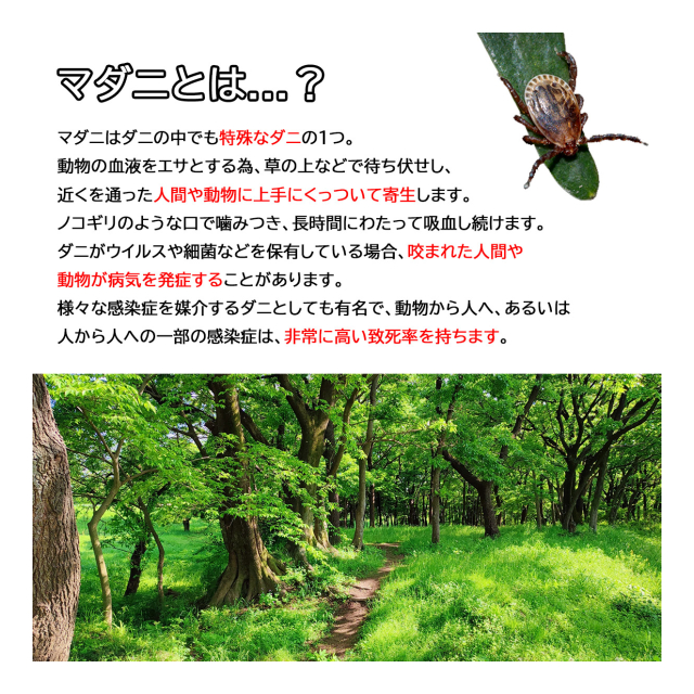 残った口や、広がった傷口から感染が広がる可能性がありますので、適切なツールで素早く、完全に除去することが大切です。●処置後は、速やかに医療機関の診断・治療を受けてください。