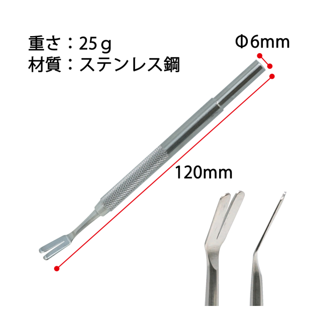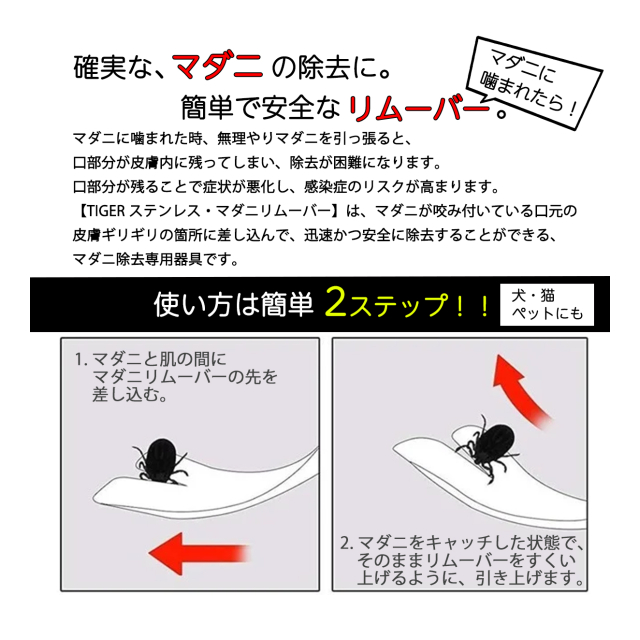 ●近年都会でも被害が急増しているマダニ。●万が一、マダニに噛まれた際の応急処置用に便利なマダニリムーバー。●ステンレス製で丈夫です。●使用後は水洗いし、繰り返し使用できます。●マダニは強力な口で噛みつくため、無理やり引っ張って取り除こうとしても、口の部分が皮膚に残ってしまう可能性があります。●