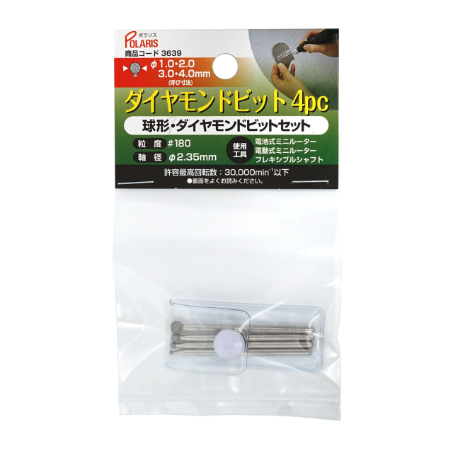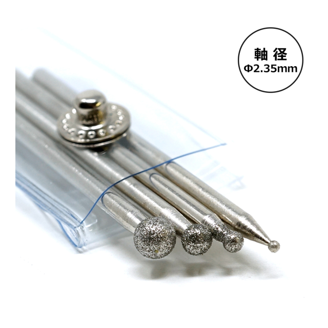 | ●セット内容:Φ1.0、Φ2.0、Φ3.0、Φ4.0mmの4サイズ●+P48粒度:#180●軸径:Φ2.35mm●対応工具:電池式ミニルーター・電動式ミニルーター・フレキシブルシャフト●許容最高回転数:30,000min‐1以下 |