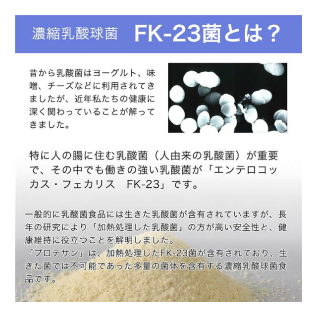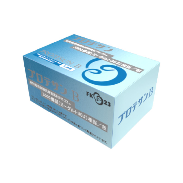 プロテサンB は、1包中に3000億個以上の乳酸菌(エンテロコッカスフェカリスFK23菌)を含有した濃縮乳酸菌粉末です。3000億個以上の乳酸菌は、1包当たり約30リットル分のヨーグルトに相当します。