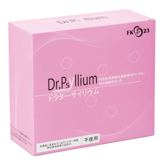 ドクターサイリウムは不溶性、水溶性の食物繊維がバランスよくとれる天然の植物由来素材「サイリウムハスク」と、独自の加熱処理を施した乳酸菌「FK-23」を配合しています。